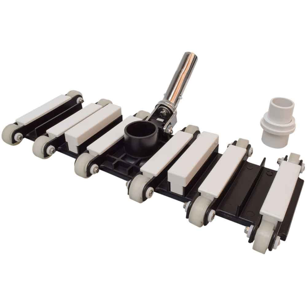 This 19" Pool Vac has it all; it's flexible enough to stay close to the surface in any bend of the pool; it has urethane ball bearing wheels for easy rolling and less work; it has a metal swivel handle for long-lasting performance, and its total weight is 6 lbs. 4 oz. ensuring the vac head stays on the pool floor without bobbing upwards. 2" port with 1-1/2" adapter.